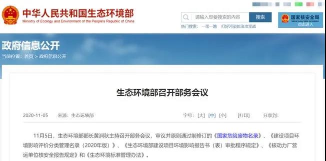 11月5日,生態(tài)環(huán)境部部長黃潤秋主持召開部務會議,審議并原則通過制修訂的《國家危險廢物名錄》、《建設項目環(huán)境影響評價分類管理名錄(2020年版)》、《生態(tài)環(huán)境部建設項目環(huán)境影響報告書(表)審批程序規(guī)定》、《核動力廠營運單位核安全報告規(guī)定》和《生態(tài)環(huán)境標準管理辦法》。