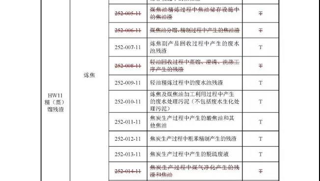 4.修改煤焦化相關危險廢物的規(guī)定。針對該類廢物重點從兩個方面進行修改:一是重新梳理并明確了煤焦化過程產(chǎn)生的各類危險廢物及其工藝來源;二是根據(jù)不同煤焦油的利用途徑,在《危險廢物豁免管理清單》中增加當煤焦油用于生產(chǎn)煤基氫化油、碳素材料、炭黑時,滿足一定條件利用過程可不按危險廢物管理的規(guī)定。