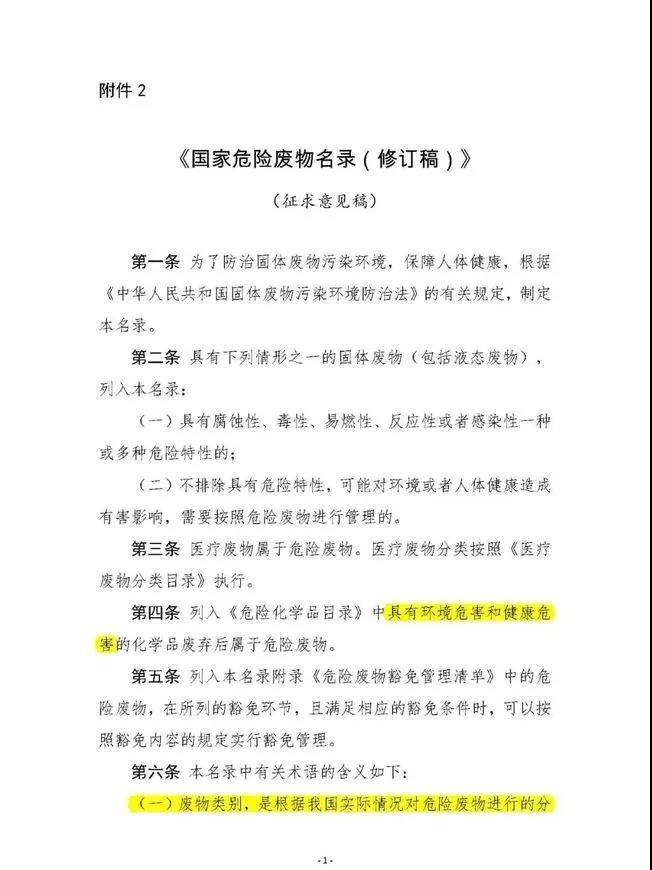 《名錄(修訂稿)》(二次征求意見稿)包括正文、附表《國家危險廢物名錄》、附錄《危險廢物豁免管理清單》。