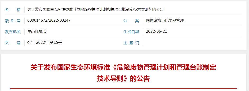 為貫徹《中華人民共和國環(huán)境保護法》《中華人民共和國固體廢物污染環(huán)境防治法》等法律法規(guī),指導(dǎo)和規(guī)范產(chǎn)生危險廢物的單位制定危險廢物管理計劃,建立危險廢物管理臺賬和申報危險廢物有關(guān)資料,加強危險廢物規(guī)范化環(huán)境管理,現(xiàn)批準《危險廢物管理計劃和管理臺賬制定技術(shù)導(dǎo)則》為國家生態(tài)環(huán)境標準,并予發(fā)布。