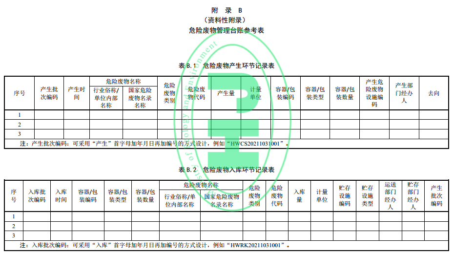 6.1.2 產(chǎn)生危險廢物的單位應(yīng)根據(jù)危險廢物產(chǎn)生、貯存、利用、處置等環(huán)節(jié)的動態(tài)流向,如實建立各環(huán)節(jié)的危險廢物管理臺賬,記錄內(nèi)容參見附錄 B。