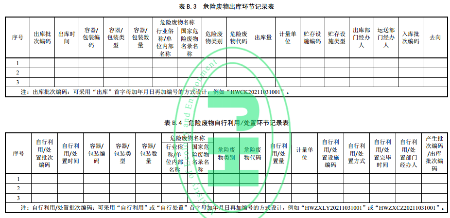 6.3.4 危險廢物自行利用/處置環(huán)節(jié),應(yīng)記錄自行利用/處置批次編碼、自行利用/處置時間、容器/包裝編碼、容器/包裝類型、容器/包裝數(shù)量、危險廢物名稱、危險廢物類別、危險廢物代碼、自行利用/處置量、計量單位、自行利用/處置設(shè)施編碼、自行利用/處置方式、自行利用/處置完畢時間、自行利用/處置部門經(jīng)辦人、產(chǎn)生批次編碼/出庫批次編碼等。