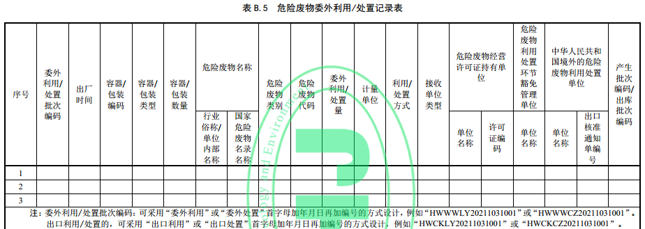 6.3.5 危險廢物委外利用/處置環(huán)節(jié),應(yīng)記錄委外利用/處置批次編碼、出廠時間、容器/包裝編碼、容器/包裝類型、容器/包裝數(shù)量、危險廢物名稱、危險廢物類別、危險廢物代碼、委外利用/處置量、計量單位、利用/處置方式、接收單位類型、利用/處置單位名稱、許可證編碼/出口核準通知單編號、產(chǎn)生批次編碼/出庫批次編碼等。