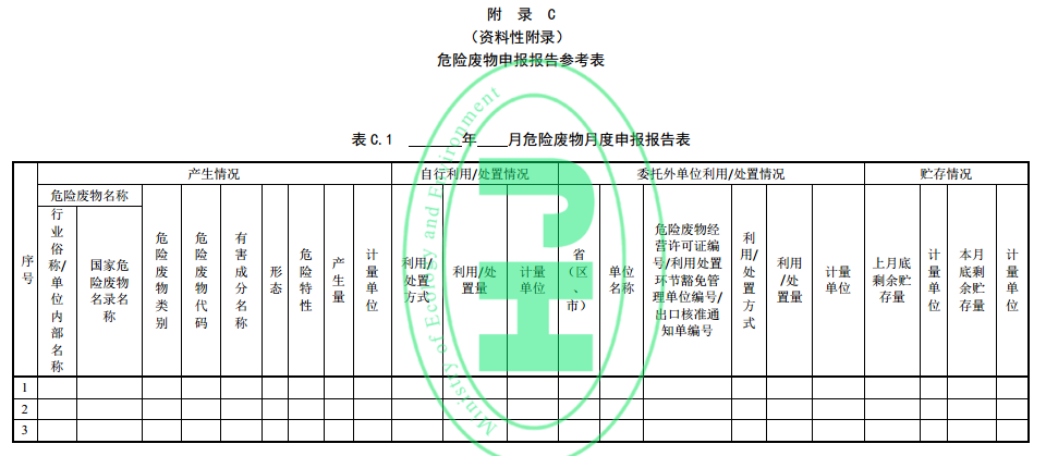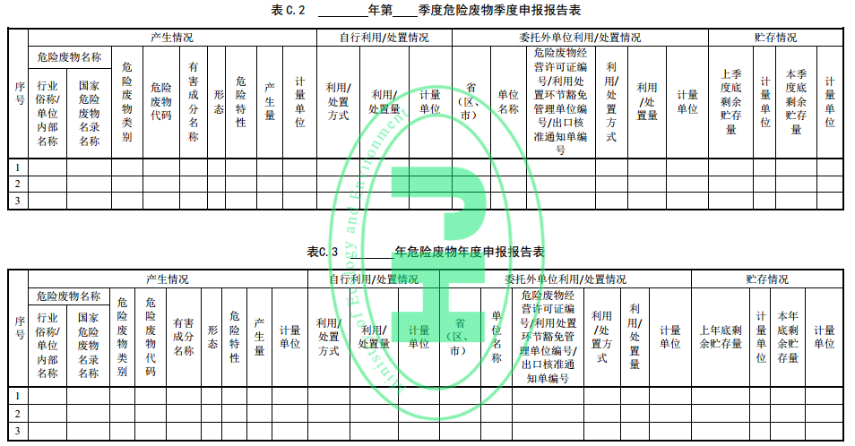 7.3.1 申報內(nèi)容包括危險廢物產(chǎn)生情況、危險廢物自行利用/處置情況、危險廢物委托外單位利用/處置情況、貯存情況,申報報告格式參見附錄 C。
