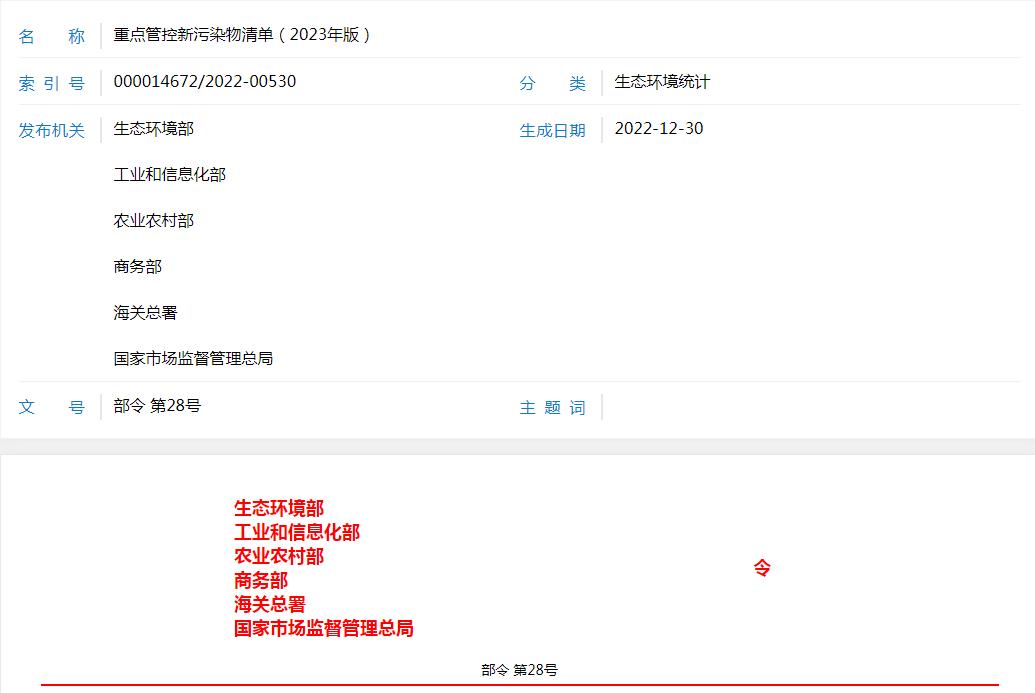 《重點管控新污染物清單(2023年版)》已于2022年11月29日由生態(tài)環(huán)境部2022年第五次部務(wù)會議審議通過,并經(jīng)工業(yè)和信息化部、農(nóng)業(yè)農(nóng)村部、商務(wù)部、海關(guān)總署、國家市場監(jiān)督管理總局同意,現(xiàn)予公布,自2023年3月1日起施行。