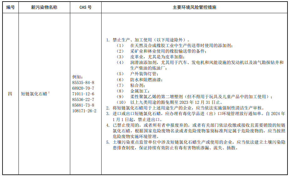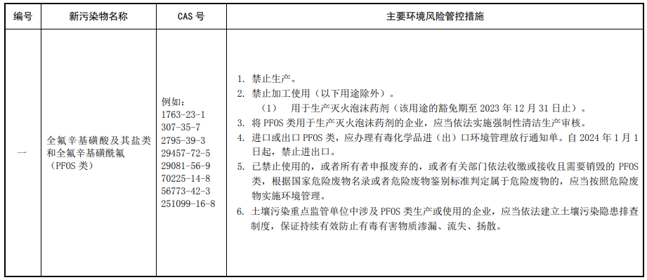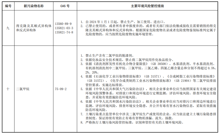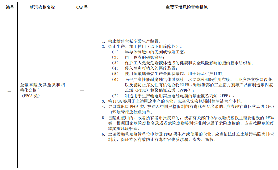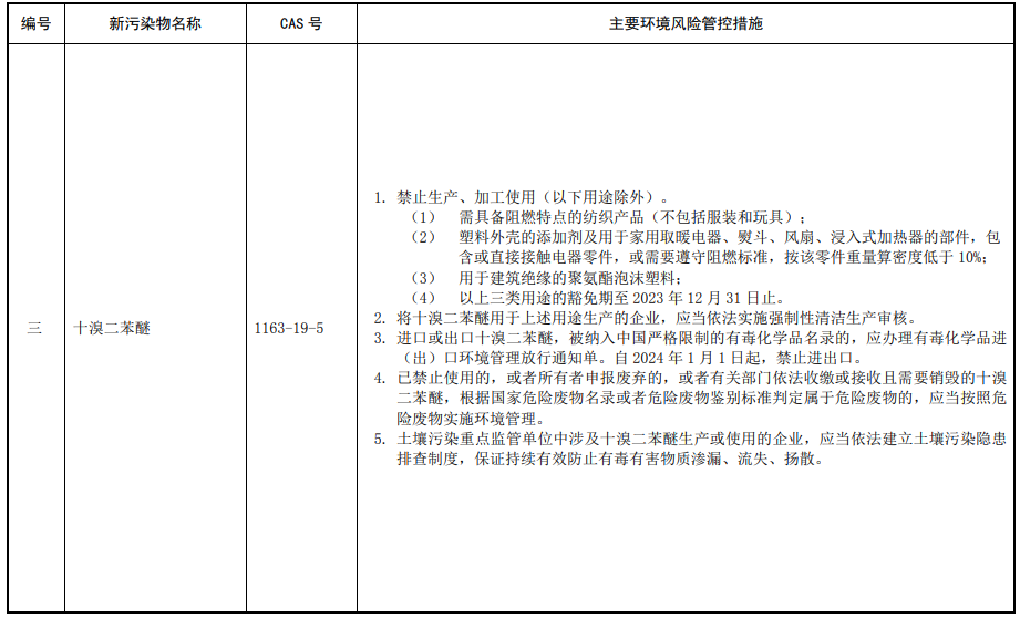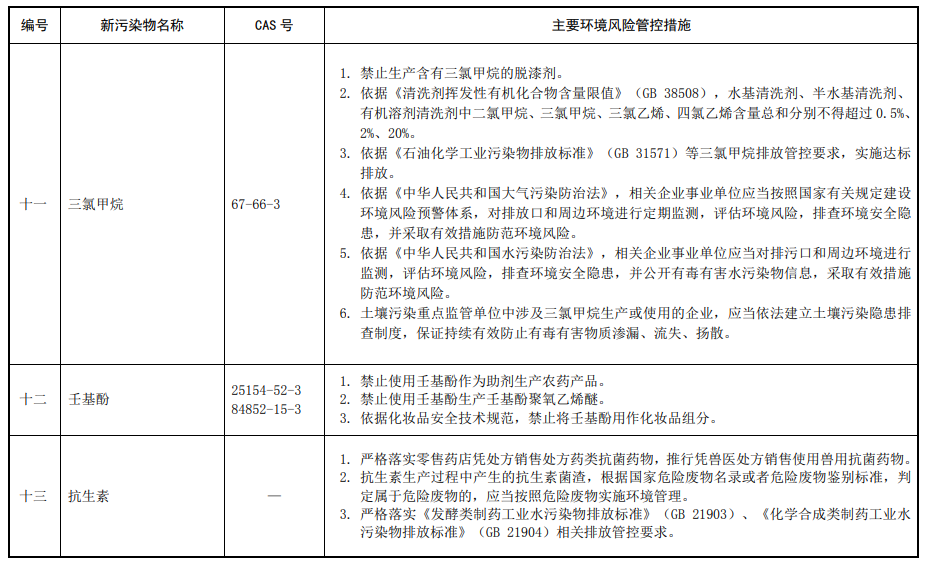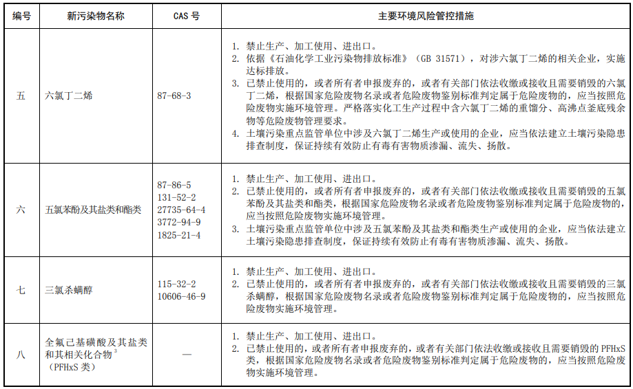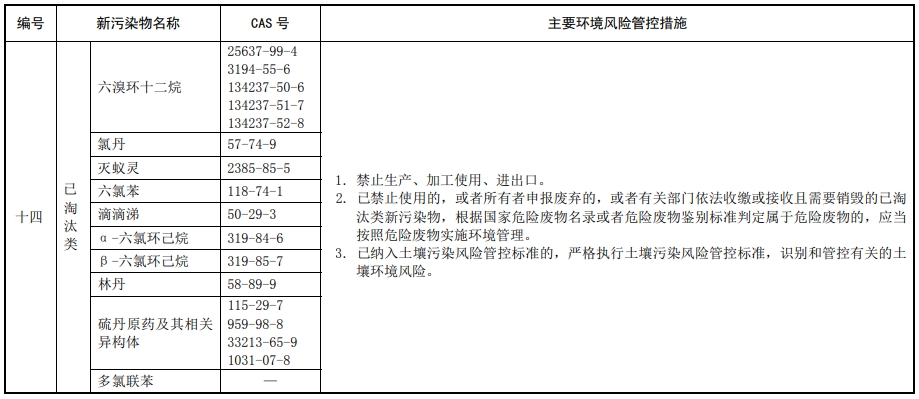 第三條 對列入本清單的新污染物,應(yīng)當(dāng)按照國家有關(guān)規(guī)定采取禁止、限制、限排等環(huán)境風(fēng)險管控措施。